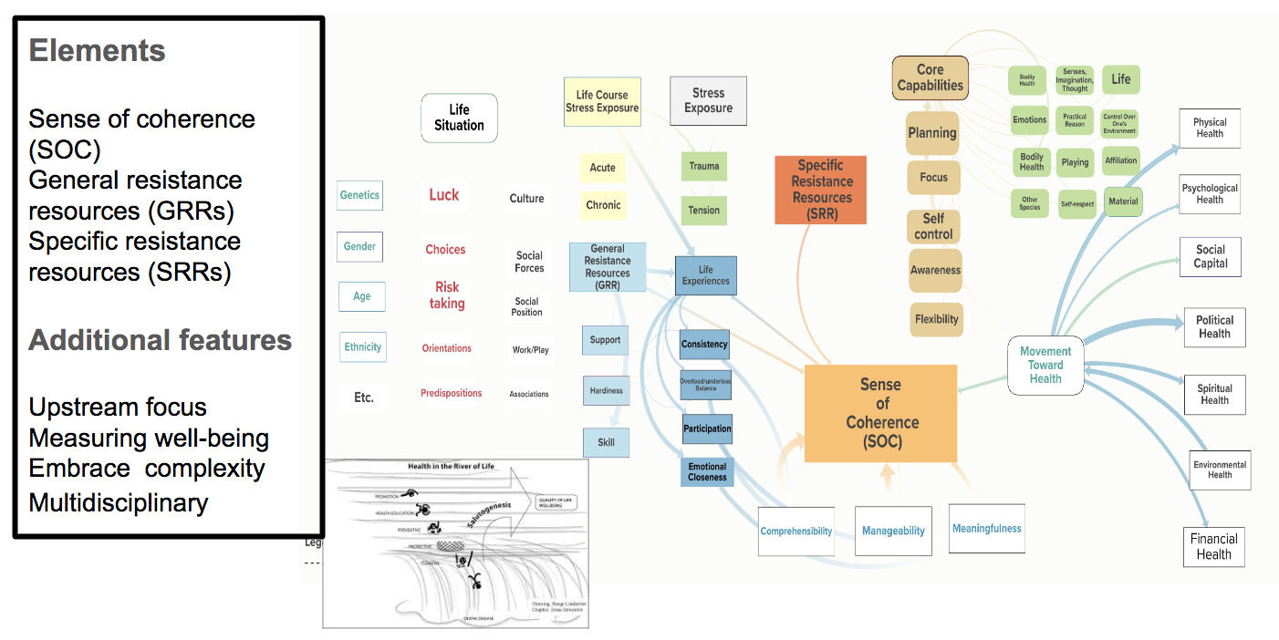 Health in the River of Life: The river of life metaphor emphasizes that people will likely experience multiple stressors in a chaotic world, and salutogenesis focuses on providing health-promoting tools and environments throughout the life course.
